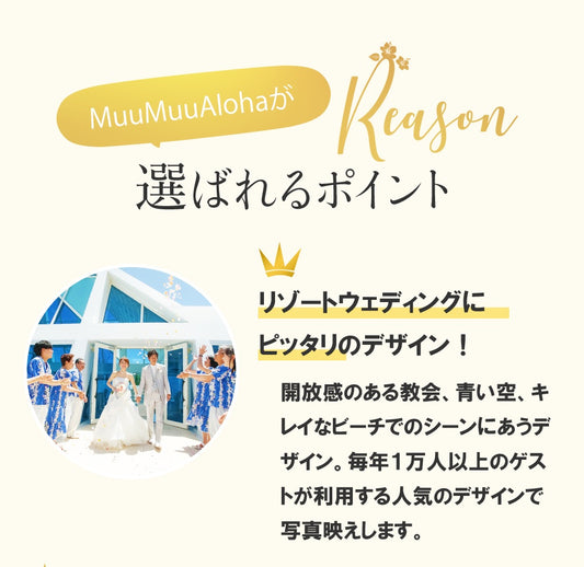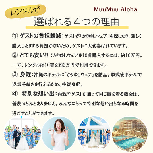 沖縄 結婚式 ハワイ 結婚式 イベントに最適なアロハシャツ かりゆしウェア ムームーをレンタルできます。購入に比べ低価格です。グループ単位でそろえると素敵な写真が撮れます。