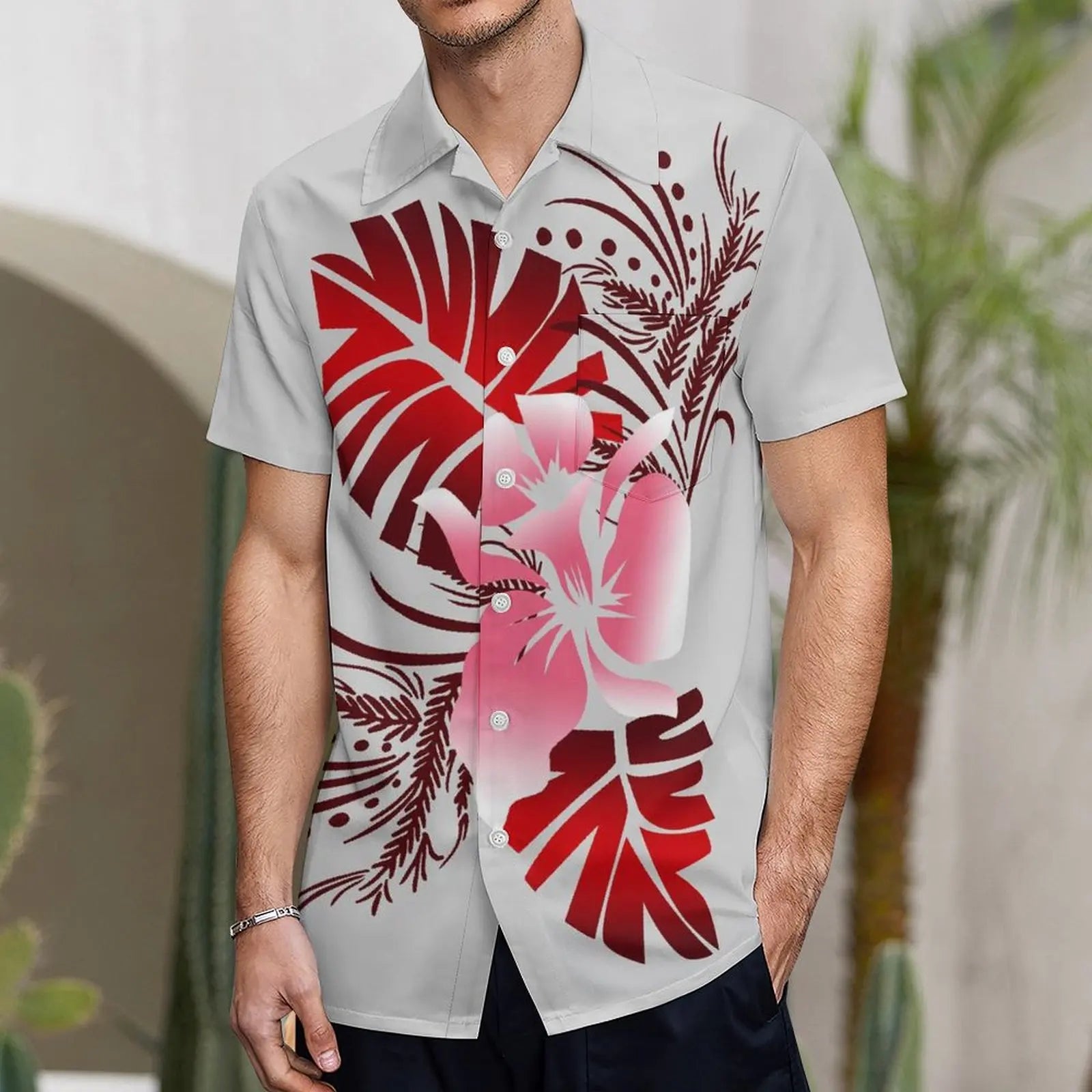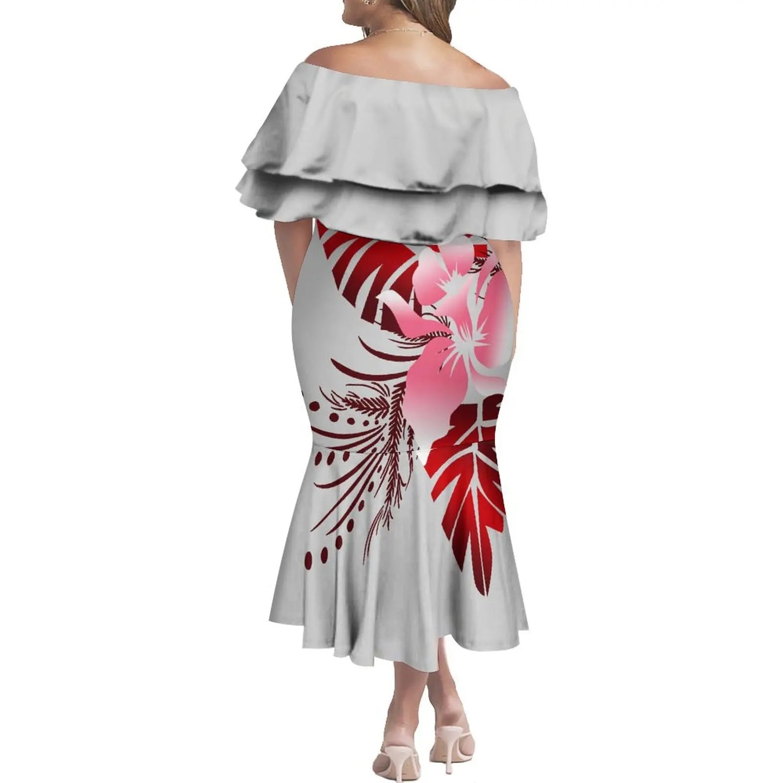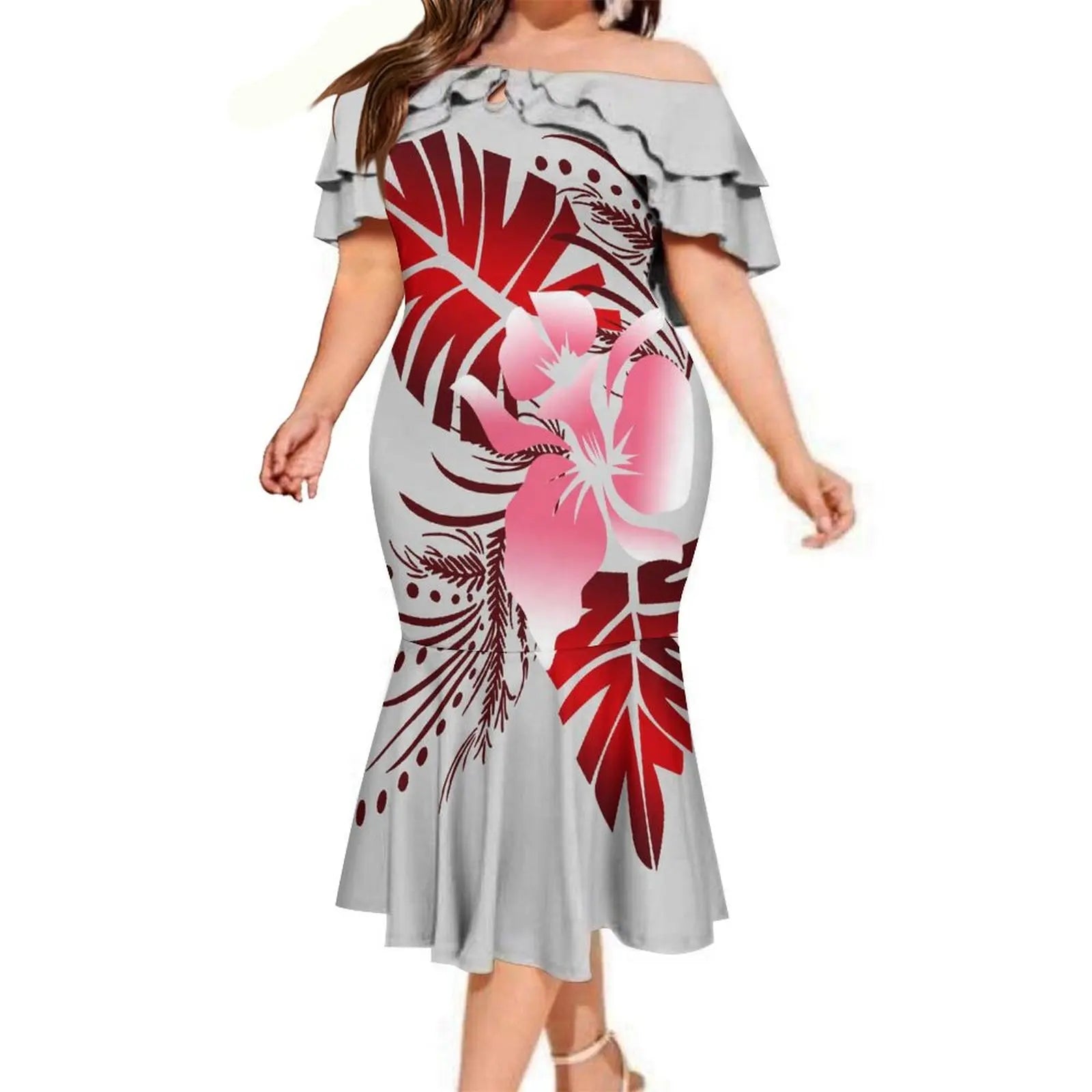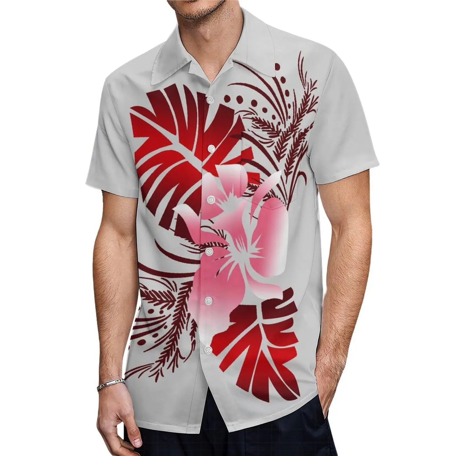 商品No.K0112【購入商品】アロハシャツ ワンピース(メンズ レディース) ペアルック ハワイ 結婚式 沖縄 グァム オーストラリア リゾートドレス 色: ライトグレー×レッド サイズ: 9XL(10L)まで