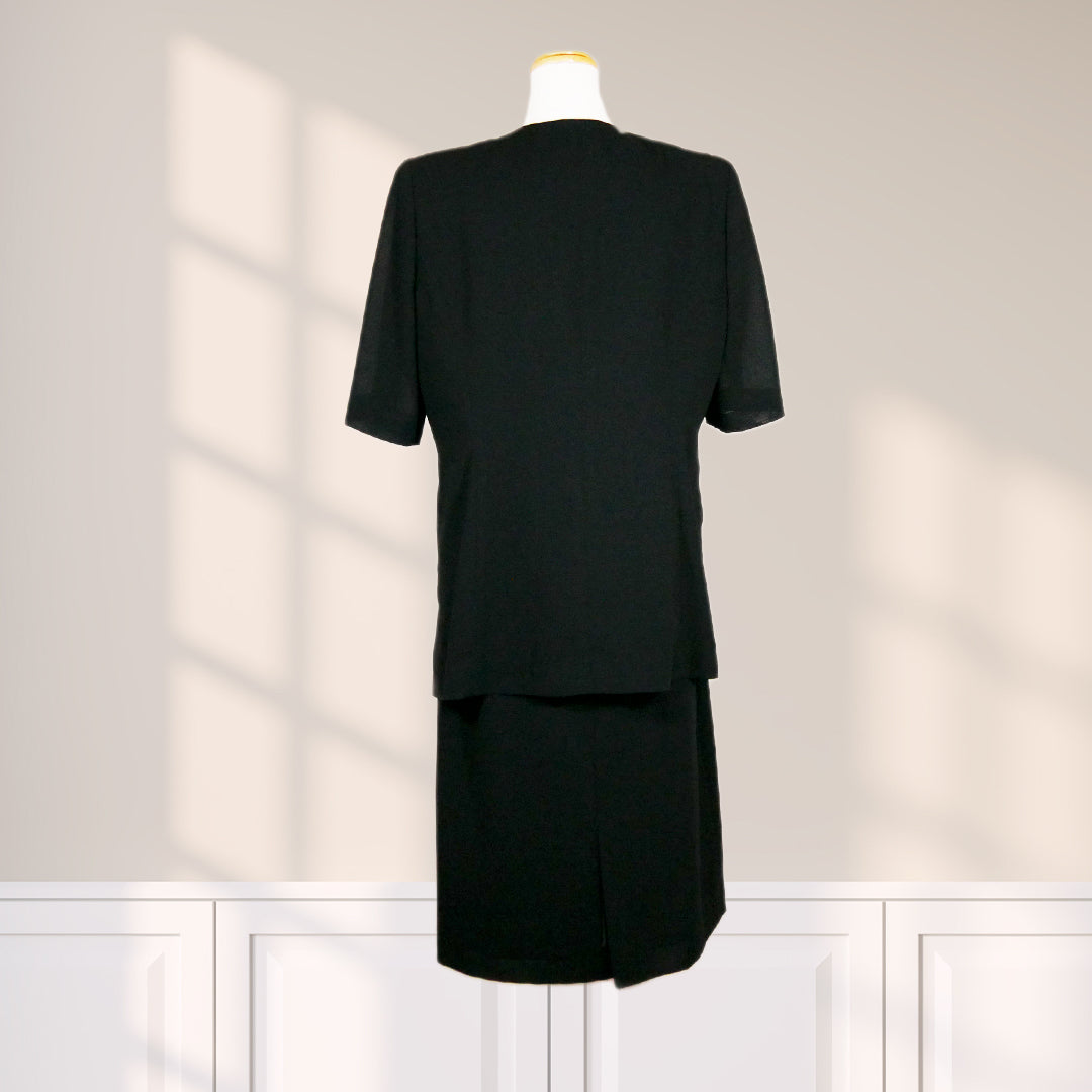 ■色、生地:【ジャケット】ブラック、ポリエステル100%、背中のみ裏地あり、肩パットあり 【スカート】ブラック、(表)ポリエステル100%、(裏)キュプラ