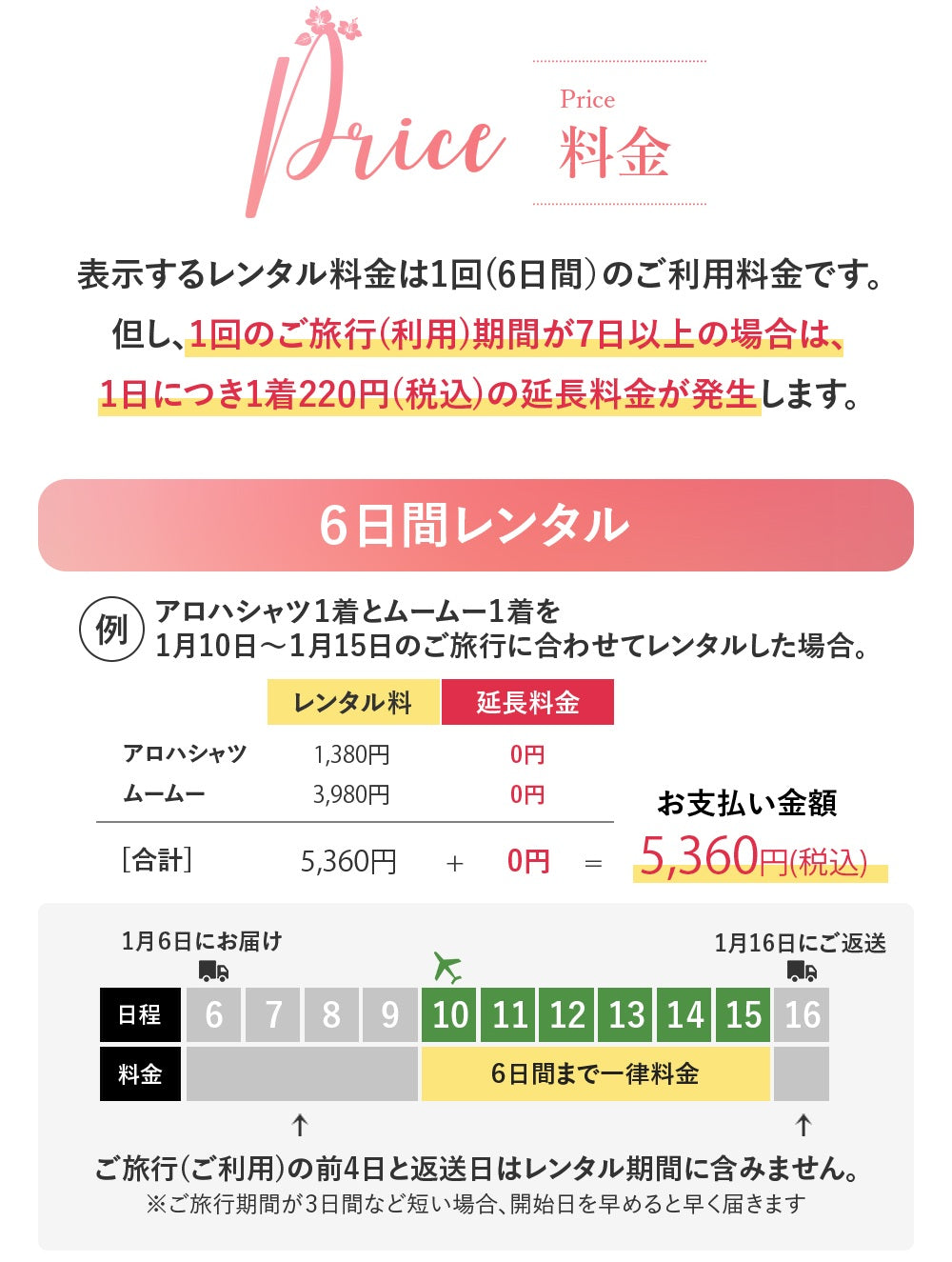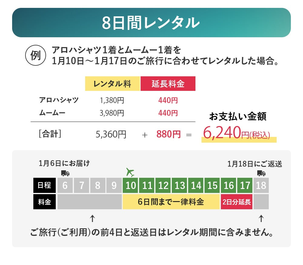 一度の旅行で完結する6日間レンタルプランを基本に、延長も可能です。