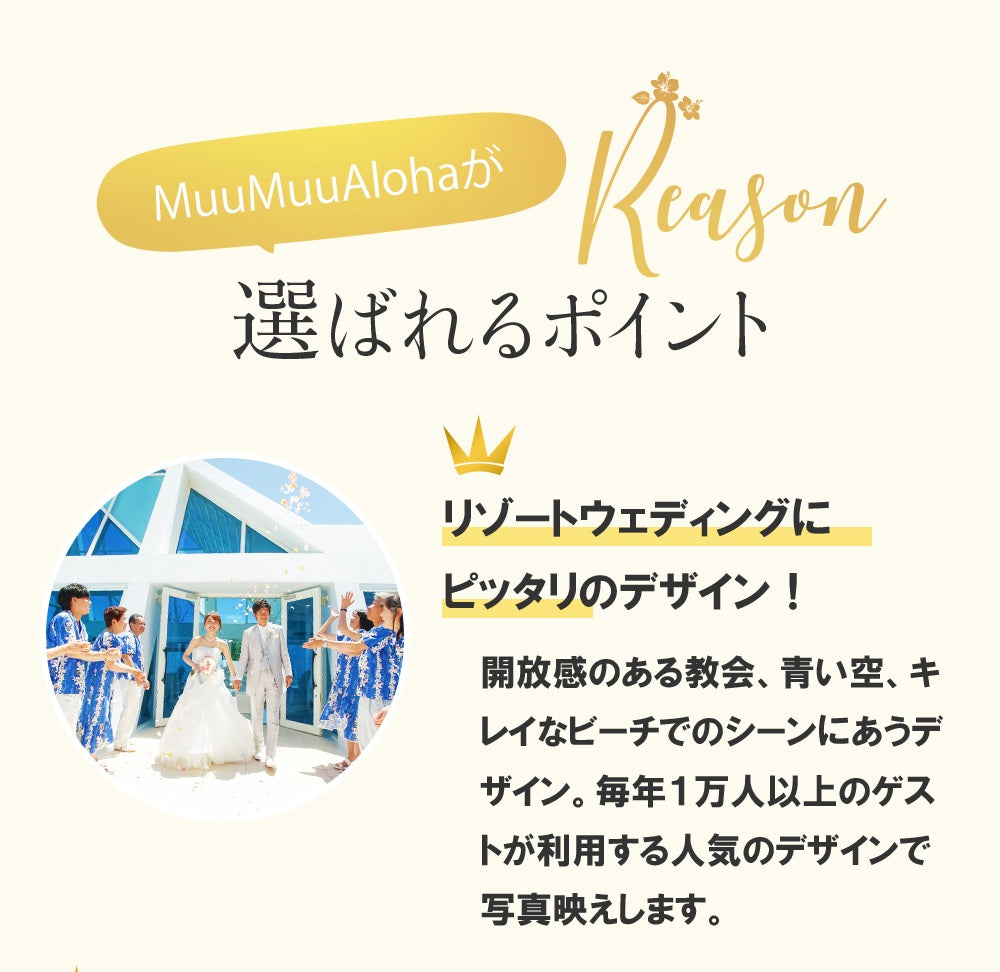 MuuMuu Alohaのレンタルサービスが選ばれる理由は、ゲストの負担軽減、コストパフォーマンス、荷物の軽減、統一感ある特別な思い出、そして安心の実績。